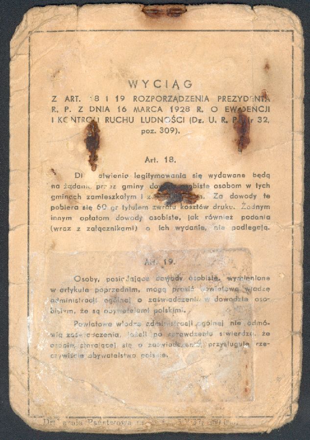 [s. 3] [Ślad po fotografii odbitej nieznacznie na s. 2] Własnoręczny podpis osoby wyszczególnionej w dowodzie / Franciszek Przytarski / Stosownie do art. 19 [---] zaświadczam, że wymieniony w ninejszym dowodzie / p. Franciszek Przytarski / jest obywatelem (ką) polskim (ą) co zostało stwierdzone / na podstawie przedłożonych / dokumentów / Urząd / Nr 5977 / Dnia 17-IX-1937 / [podpis nieczytelny]