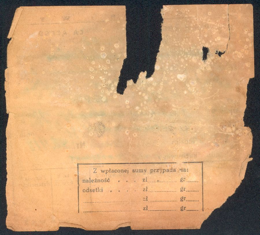 [s. 1] Sk[ar]bowy / [Po]twierdzenie dla wpłacającego / zł. 198 gr 07 / słownie złotych sto dziewięćdziesiąt osiem / gr 07 / (imię i nazwisko lub firma zobowiązanego do zapłaty) Alojzy Wojtowicz / (dokładny adres) Prosta 12 m. 8 / wpłacił tytułem (nazwa należności) podatku kumulacyjnego (okres) 1935 r. / na rzecz urzędu Skarbowego N 19 na konto czekowe w Pocztowej Kasie Oszczędności Nr. 38419 / Urzędu Skarbowego w Warszawie / [podpis nieczytelny]